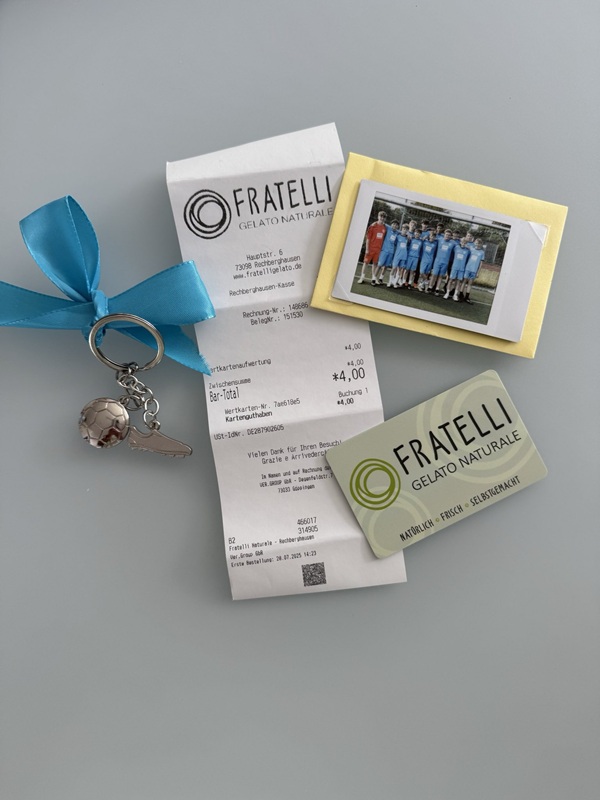 Auch die Spieler durften sich anschließend über eine kleine Anerkennung in Form eines Schlüsselanhängers, eines Eisgutscheins und ebenfalls eines aktuellen Mannschaftsfotos freuen.