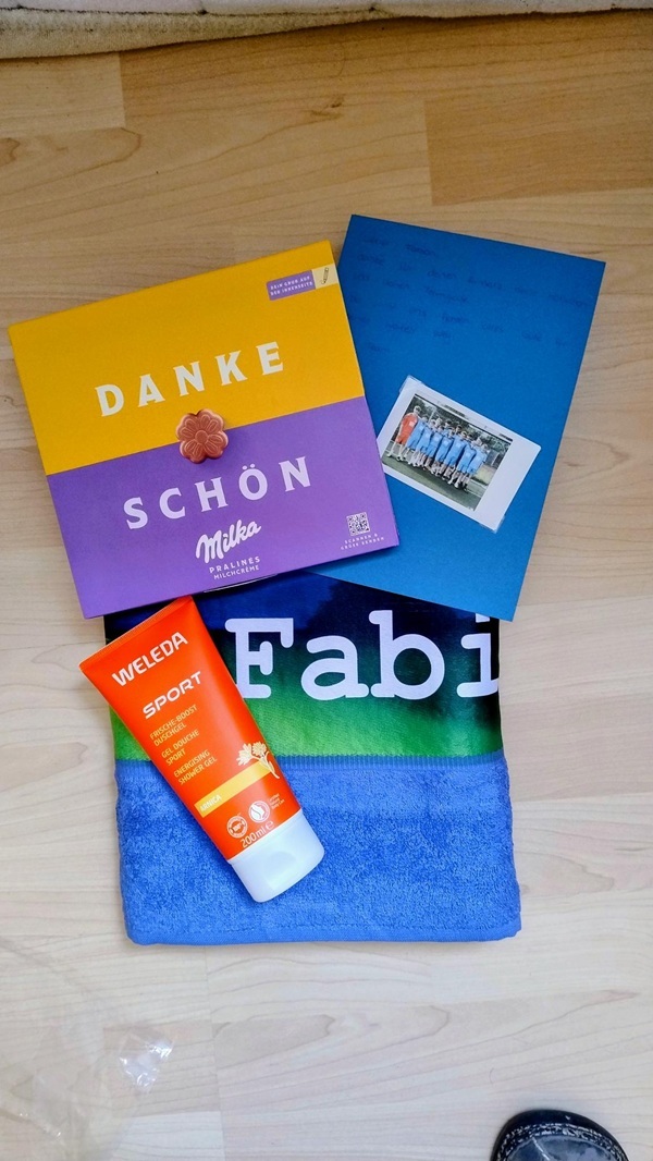 Es folgte ein emotionaler Moment: als kleines Dankeschön erhielten die Trainer von ihrer Mannschaft ein personalisiertes Handtuch mit einem Duschgel, Schokolade (für die Nerven) sowie eine Karte mit einem aktuellen Mannschaftsbild von diesem Abend.